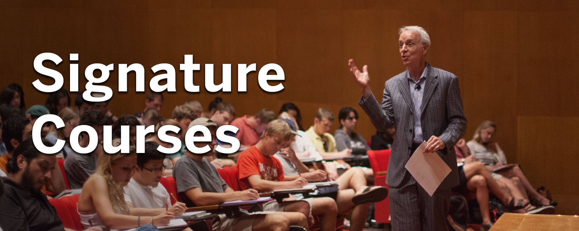 A male professor walks through his class as he lectures. Caption reads "Signature Courses".