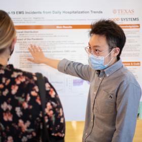 As part of Research Week 2022, the Office of Undergraduate Research (OUR) hosted the Longhorn Research Poster Session in the Texas Union Ballroom on April 20. Students presented more than 180 research posters on interdisciplinary topics ranging from art education to electrophysiology to history. This year’s event marked a return to an in-person poster session, where students presented large-format posters of their research to attendees. The top presenters were selected for $2,000, $1,000, and $500 awards. Judges also selected the recipient of a $500 award for poster design, and event attendees voted for a $1,000 audience choice award.